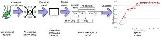 Figure 1 illustrates the specific flow of signal detection. The advantages of an electronic nose are a rapid identification capability, a high-precision recognition performance, ease of use, and portability. Metal oxide semiconductor (MOS) sensors are the most popular gas sensor array modules, due to their cheap price and long operational life. This sort of sensor not only ensures the electronic nose’s efficiency but also offers apparent advantages in terms of commercial application and process maturity, making it the most comprehensive and mature sensor type on the market today.