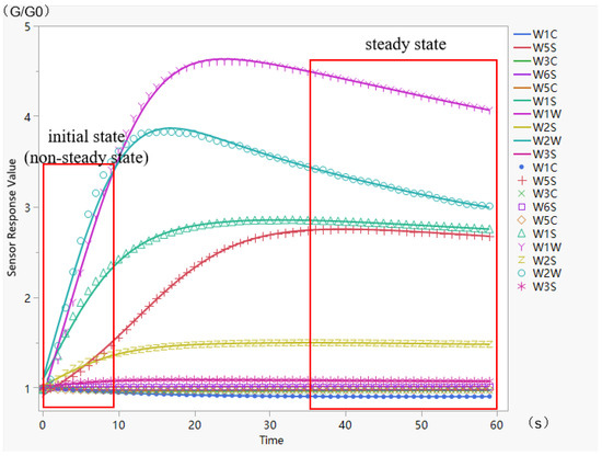 Figure 3 shows the gas concentration graph over time for the electronic nose during the detection procedure (the horizontal coordinates of the graph are seconds and the axial coordinates are the response values of the electronic nose). In routine electronic nose detection, the value when the gas enters a steady state is commonly utilized for classification analysis [