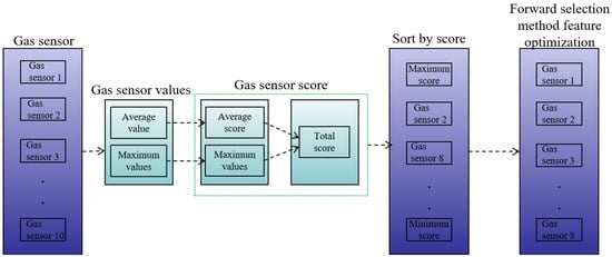 In this work, two crucial eigenvalues were chosen: the average gas concentration 10 s ago and the value with the greatest deviation from the initial concentration. The feature matrices were built with dimensions of 10 (number of sensors) × 2 (eigenvalues) × 5 (percentage humidity), totaling 100 dimensions, and their RF classification scores were calculated. By adding the scores of these two features, we calculated the overall feature prioritization score for each sensor, which reflects the sensors’ combined relevance in the classification process. Finally, the sensor scores were weighted and inserted into the classification model’s output findings to achieve the best sensor combination. This allowed us to assess the value of each gas-sensitive sensor in the classification process, as well as to choose and optimize features for the sensor combination.