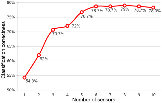 Figure 5 shows the feature optimization results. In order to find the best feature optimization group, the datasets collected under all humidity conditions were used to participate in the feature optimization results, and the final optimization results were compared using the average correct discrimination rate of tea leaves. As can be seen from the results, the accuracy of the feature-optimized test set peaked at the streamlined combination of eight sensors, with an optimal discrimination correct rate of 79%. The optimization process was successful in significantly reducing the number of sensors and the dimensionality of the feature matrix with almost no impact on classification accuracy, which not only improves data-processing efficiency while ensuring that the effective information of the data is not lost, but also lowers the computational cost of the model.