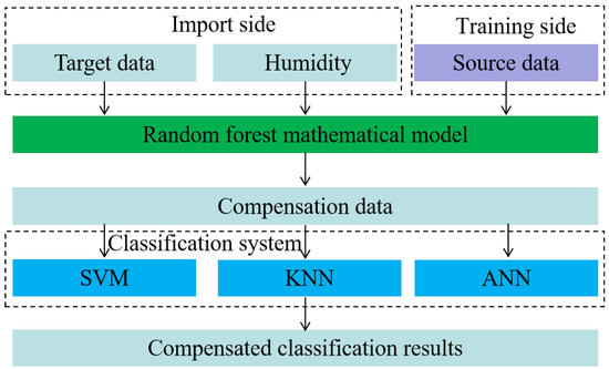 In this study, we performed an in-depth compensation analysis of the feature-optimized dataset using the RF compensation model, intending to improve the electronic nose’s classification accuracy and drift resistance. We chose to train in high relative humidity conditions (80% and 95%). This is because the electronic nose gave the best classification results under these conditions, demonstrating that the dataset is less prone to drift and has higher classification accuracy at these humidity levels. The datasets collected under these conditions were used as the source domain, or training dataset, to train the electronic nose’s humidity compensation model. Furthermore, we used the compensation model to handle the low humidity datasets (35%, 50%, and 65%), which have lower average classification results.