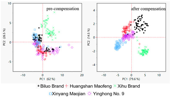 Figure 7 depicts a comparison of principal component analysis (PCA) before and after adjustment under rapid testing settings. Before the correction, the distributions of different tea types (represented by different colors and shapes in the picture) had more intersections, and certain tea varieties’ sample points were relatively dispersed. This distribution characteristic suggests that the original data were not adequately separated between tea kinds. After the compensation model corrected for data drift, the corrected tea data had sharper cluster boundaries in the PCA graphic. This adjustment increased the distinction between tea kinds and clarified their confidence intervals in the PCA space. This increased clustering impact implies that the compensated model may effectively correct data drift while also increasing the model’s sensitivity for tea variety identification. As a result, the compensated PCA not only demonstrated the distinctness of tea kinds but also provided significant data support for the speedy and precise identification of electronic noses. This demonstrates the compensation model’s effectiveness and applicability in tea variety identification.