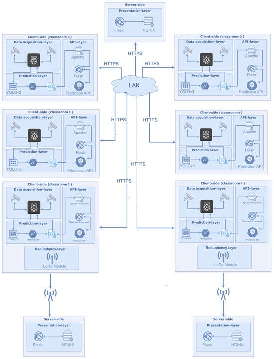 The improved system architecture for emergency management is reported in Figure 1. It is always based on a fat client–thin server architecture where the computation load weighs on clients. Each client is equipped with an additional battery to ensure the client’s work even in case of emergency. The system differs from the previous one just due to some adjustments. There are some clients (in the Figure, the ones in classrooms #5 and #6) that have a further layer, the Redundancy one. Such clients were strategically chosen since they are at the opposite end of the campus. The Emergency Data Transfer feature was implemented, which leverages LoRa (Long Range) technology to ensure critical data are preserved and transferred during network failures or other emergency scenarios. LoRa is a low-power, long-range wireless communication technology that provides robust and reliable data transmission over distances significantly greater than are possible with traditional Wi-Fi or Bluetooth solutions. This makes it an ideal choice for ensuring data continuity in a smart campus environment.