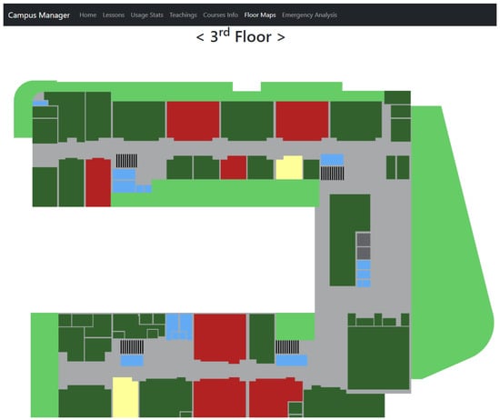 Finally, we want to remark that the focus of this work is to develop a support tool for emergency management that operates with minimal and well-defined requirements. Specifically, the tool is designed to gather and utilize occupancy data, detailing the number of people present in various classrooms and laboratories within a smart campus. While our case study employs cameras and Raspberry Pi devices to collect this information, the system is intentionally designed to be flexible. The web UI we have developed, which will be detailed in the following subsection, relies solely on an API to retrieve occupancy data, making it adaptable to a variety of sensor technologies. The decision to limit the scope of required sensors was driven by practical considerations. Although integrating additional IoT devices, such as fire detection sensors, could enhance the system’s functionality, we recognized that many buildings, including those on the campus of our case study, lack the necessary APIs or interfaces to retrieve data from these existing emergency sensors. This limitation could significantly restrict the applicability of a system reliant on such integrations. By focusing on a solution that can operate independently of these additional sensors, we ensure that our tool remains versatile and can be implemented in a wide range of environments. This approach allows the system to be deployed in buildings that may not have advanced IoT infrastructure while still providing essential support for emergency management.