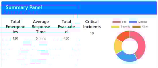 The Summary Panel, depicted in Figure 3, is the top section of the Emergency Statistics page, and is designed to provide users with a high-level overview of key emergency statistics at a glance. This panel is the first point of interaction for users, offering a quick and comprehensive snapshot of recent emergency events and their critical metrics. At the core of the Summary Panel are several key metrics that capture the essence of emergency performance. These metrics include the Total Emergencies recorded over a specified period, giving users an understanding of the frequency of incidents. The Average Response Time metric highlights the efficiency of the emergency response teams, showcasing how quickly they can react to emergencies. The Total Evacuated metric provides an aggregate count of individuals safely evacuated, reflecting the effectiveness of the evacuation protocols. Additionally, the Critical Incidents metric tallies the number of high-severity incidents, indicating areas that may require more focus or resources. The Summary Panel also incorporates a doughnut chart that displays the types of emergencies.