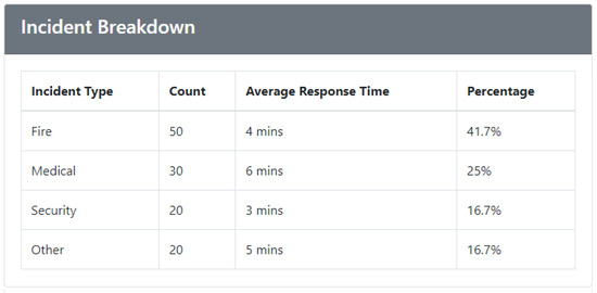 The next component of the page is the Incident Breakdown, shown in Figure 4. It offers a detailed and categorized analysis of various types of emergencies that have occurred. This section is critical for users who need to understand the nature and distribution of incidents within the building or campus. By organizing incidents into specific categories such as fire, medical emergencies, security breaches, and others, this section provides a granular view of the different types of emergencies, allowing users to identify patterns and trends. Each category in the Incident Breakdown is accompanied by a comprehensive set of statistics presented in a tabular format. The statistics table includes counts, averages, and percentages for each incident type, providing detailed insights into the frequency and impact of different emergencies. For instance, users can see the total number of fire incidents, the average response time for medical emergencies, and the percentage of security breaches relative to all incidents. This level of detail helps emergency managers and decision-makers pinpoint which types of incidents are most common and where response efforts may need to be focused or improved.