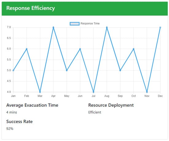 The next component on the page is Response Efficiency, whose UI is depicted in Figure 5. It lists some metrics to evaluate the speed, efficiency, and effectiveness of the emergency response process, offering insights that are crucial for improving future performance and ensuring the safety of occupants. It is designed to help users understand how quickly and effectively their teams are responding to emergencies, identifying strengths and areas for improvement. It is composed of two main parts. The first one visualizes a line chart that shows response times across different incidents. Users can quickly identify patterns, such as the most common response times or outliers where the response was unusually slow. By analyzing these distributions, emergency managers can assess whether their teams are meeting established benchmarks and identify any factors that may be contributing to delays. The second one reports some metrics, instead. The Average Evacuation Time provides the overall average time taken to evacuate people from affected areas, offering insights into the effectiveness of current evacuation plans and protocols. Additionally, the section includes data on Resource Deployment, such as the number and types of resources (e.g., personnel, medical supplies, equipment) utilized during emergencies. This helps users understand how resources are being allocated and whether they are sufficient to meet the demands of different incidents. Lastly, the Success Rate metric, which indicates the percentage of successful evacuations versus unsuccessful or partial evacuations, provides a clear measure of overall effectiveness. Together, these metrics form a comprehensive picture of response efficiency, enabling data-driven decisions to enhance emergency preparedness and response strategies.