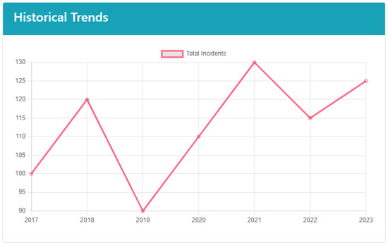 Another component is the Historical Trends section, situated at the bottom of the Emergency Statistics page, which provides a longitudinal view of emergency data, enabling users to analyze how various metrics have evolved over time, as shown in Figure 6. This section is essential for identifying patterns, assessing the effectiveness of past interventions, and making informed decisions to improve future emergency response strategies. By offering a temporal perspective, the Historical Trends section helps users understand the broader context of their emergency management efforts. The Historical Trends, a line chart visualizing the total incidents per year, represent the main content.