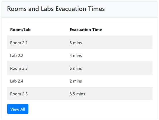 The following component is the Rooms and Labs Evacuation Times, shown in Figure 7. It provides a detailed overview of the evacuation efficiency for each individual room and laboratory within the facility. This section is crucial for understanding how different areas of the building respond during emergencies, and can highlight specific zones that might need further attention or improvements in evacuation protocols. The information is presented in a clean, tabular format, making it easy for users to quickly identify and compare evacuation times across various rooms and labs. Each row in the table corresponds to a specific room or laboratory, listing the room/lab name and its respective evacuation time. Initially, just a subset of rooms and laboratories are displayed. By clicking the “View All” button, users can visualize all the data and have the possibility of ordering and filtering them. This structured layout allows for a straightforward comparison, enabling emergency response teams to pinpoint areas with longer evacuation times and investigate the underlying causes. For instance, if certain labs consistently show longer evacuation times, it may prompt a review of their layout and exit accessibility, or the evacuation training provided to personnel in those areas. This targeted analysis is essential for continuous improvement in emergency preparedness.