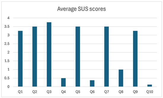 The average score for each SUS question is illustrated in Figure 9. Notably, questions “I thought the system was easy to use” (item #3 in SUS) and “I needed to learn a lot of things before I could get going with the system” (item #10 in SUS) received exceptionally high scores of, respectively, 3.75 out of 4 and 0.125 out of 4. This suggests that participants found the system easy to use, well-integrated, and effective for monitoring building evacuations.