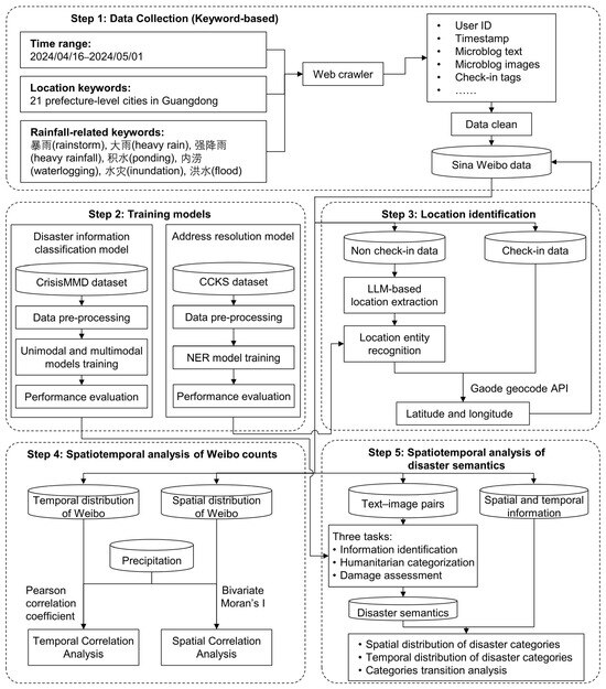 The workflow of this study is comprised of five steps, as illustrated in Figure 1. The initial step involved the collection of Weibo data based on pre-defined keywords, with the objective of establishing a comprehensive disaster social media database. Secondly, deep neural network models are trained for the extraction of disaster-related information and the recognition of location entities on the publicly available dataset. Thirdly, location information is extracted from Weibo data by LLM and NER models and subsequently encoded into spatial coordinates. Fourthly, the correlation between the number of Weibo posts and precipitation is quantified through quantitative analysis. Finally, the multi-level disaster semantics are extracted using the classification models, and the social perception of the disaster situation is investigated in conjunction with spatiotemporal information.