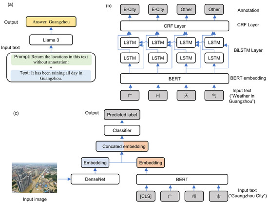Workflow diagrams for (a) Llama3, (b) BERT-BiLSTM-CRF, and (c) the multimodal models.