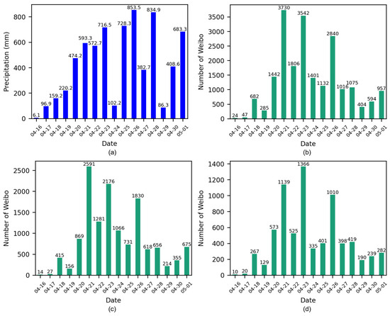 To examine the perception of heavy rainfall by social sensors, the number of daily Weibo posts from 16 April to 1 May was quantified. To quantify the severity of the disaster, daily rainfall data were collected and are presented in Figure 5a. From 16 April to 19th, the study area experienced minimal rainfall, resulting in a relatively low number of Weibo posts (Figure 5b). The precipitation on 20 April was twice as high as that of the previous day, and the number of Weibo posts also doubled, indicating a notable public response to the rainfall. From 20 April to 28 April, continuous rainfall caused severe damage, resulting in a sustained period of high Weibo activity with daily posts consistently exceeding 1000. Then, a further round of precipitation from 21 April to 1 May was accompanied by a rise in the number of Weibo posts. The peak in the number of Weibo posts occurs earlier than the peak in precipitation, which may indicate a waning public interest in the ongoing rainfall topic. The fluctuations in the number of Weibo posts largely reflected the patterns of precipitation, with the exception of 19 April and 25 April. To quantify the consistency of this relationship, a correlation test was performed using the Pearson correlation coefficient (PCC). As evidenced in Table 9, the correlation between the number of Weibo and precipitation is 0.6367, with a p-value less than 0.01, indicating a strong correlation. This result demonstrates the reliability of Weibo data as a research object.