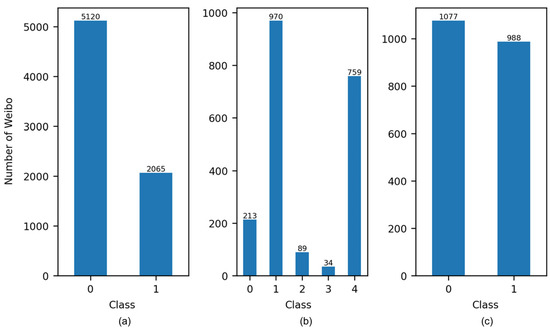 The trained multimodal model is used to predict disaster categories from Weibo posts. Prior to this, it is necessary to undertake preprocessing in order to address the discrepancies between the Weibo data and the training dataset. As illustrated in Figure 4a, the length of Weibo texts is considerably longer than that of the training dataset. The maximum length of the training dataset is approximately 60, yet there are numerous Weibo texts that exceed this length. To mitigate this discrepancy, the Weibo texts were segmented into shorter sentences with punctuation marks with a maximum length of 60. In addition, some Weibo posts contain multiple images, while the multimodal model is unable to process. The distribution of the number of images in Weibo posts is shown in Figure 4b, which depicts 7303 (7303 = 3638 + 958 + 676 + 454 + 98 + 442 + 48 + 51 + 938) multimodal posts and 13,674 unimodal posts. The number of Weibo posts with multiple images (3665 = 7303 − 3638) is approximately equivalent to that of posts with one image (3638), and thus cannot be disregarded. In order to utilize all images, each image in the sample was paired with each text segmentation. Subsequently, a max pooling operation was employed to fuse the aforementioned paired features for the purpose of prediction. Similarly, 200 multimodal Weibo posts were randomly selected and manually classified to serve as the test set. The results for precision, recall, F1-score, and AUC are listed in Table 7. The F1 scores for the three tasks are 0.8713, 0.8796, and 0.7808, with AUC values of 0.9339, 0.9219 and 0.7102, respectively. These results suggest that the classification outcomes accurately represent the multimodal content.
