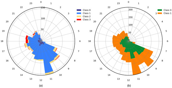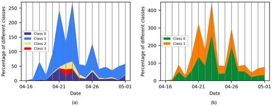 The proportions of disaster-related categories were obtained through the application of the classification models to the dataset. With regard to Task 1 (Figure 7a), the largest proportion is “Not informative”, with informative samples accounting for less than 30%. Figure 7b illustrates the proportion of informative posts within the humanitarian categories. A total of 70% or more of the samples contain humanitarian content, with the largest number of samples falling within the “Other relevant information” category and the smallest number of samples falling within the “Affected individuals” category. This proportion is associated with the characteristics of heavy rainfall. The impacts of persistent precipitation accrue gradually, resulting in the continued accumulation of weather-related data within the “Other relevant information” category. Furthermore, individuals receive warning notifications and proactively avoid flood-prone areas, resulting in a reduction in observations of affected individuals. Figure 7c depicts the damage estimation for informative posts, with approximately half of them classified as severe damage. This suggests that there is a public awareness of the potential for disasters and that social sensors can be used as a means of monitoring the emergence of new risks.