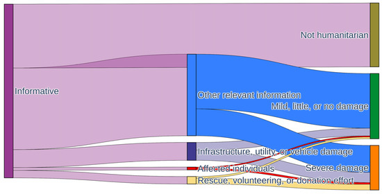 The semantics of disasters in social media data are highly heterogeneous, and the mixing of information on different topics reduces their application value [32]. For example, the objective of identifying victims is primarily focused on human-related data, while the objective of disaster reconstruction is centred on damage-related information [70,71]. For this reason, multiple classification tasks were established in a hierarchical structure to facilitate the efficient extraction of disaster-related information. Specifically, three subtasks from the open-source dataset CrisisMMD [72] were designed as strategies for the hierarchical extraction of disaster-related information. Firstly, the collected posts were classified into two categories: “Informative” and “Not informative”. The classification was based on the presence or absence of disaster-related information. Secondly, the collected posts were further classified into a number of fine-grained humanitarian categories based on semantic features. Thirdly, the damage severities were evaluated and classified. The detailed definitions of these categories are in accordance with those set forth in the CrisisMMD dataset. Some categories with approximate meanings have been merged, as shown in Table 4.