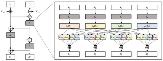 SEED is a 128-bit symmetric key encryption algorithm with a 16-round Feistel structure []. Figure 1 shows the structure of its Feistel function F. The function first computes the XOR (⊕) between the 32-bit inputs (C and D) and round keys ( and ). Next, it calculates function G and the 32-bit modular addition (⊞) three times. Function G consists of two 8-bit S-Boxes , permutated by ANDing with the constants , and and XORing four bytes. That is, the permutation is composed of a 6-bit extraction of each of the four S-Box outputs and their XORing. The SEED S-Boxes are defined as follows: