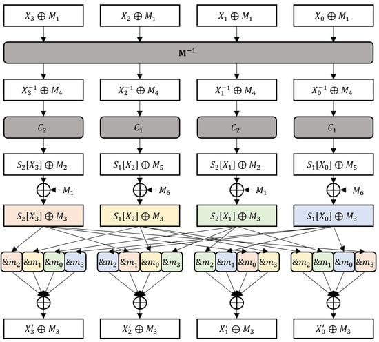 Likewise, the output of the second XOR, whose operand is the first XOR output and , consists of six bits of the unmasked intermediate value. As the output of AND between any two elements in is zero, the second XOR output can be split as shown in Equation (3). The second XOR output consists of two bits of each of the unmasked XORed S-Box outputs , , and and two bits of masked .
