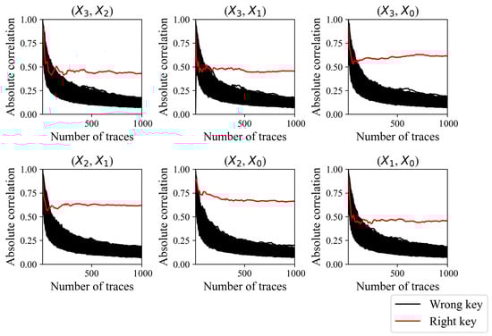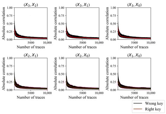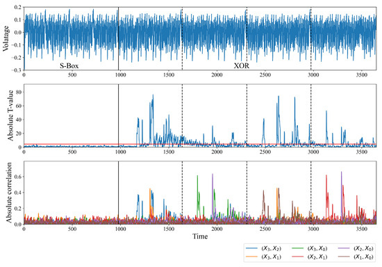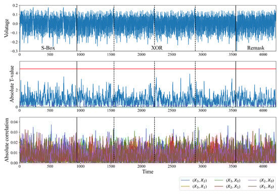 Figure 3 shows the point-wise T-value and the absolute correlation coefficient of the right intermediate value. The maximum absolute T-value of power consumption during the XOR operation is 76.1, which is considerably higher than the threshold of 4.5 (represented by the red line in the middle subplot of Figure 3). This outcome signifies that the null hypothesis is rejected with a confidence level of 99.999%. That is, the power consumption is related to the input; the mask does not conceal some of the intermediate values related to the input. For the CPA, we assume a practical attacker model in which the adversary does not know the order of the XORs; the 8 bits of the XORed S-Box outputs are used as an intermediate value. The bottom subplot of Figure 3 shows the absolute correlation coefficient of each intermediate value. in the legend indicates that the intermediate value is . As expected, in Section 3.1, the power consumption is related to the secret intermediate value. The correlation of the intermediate value derived from the front three XOR operands is significantly high. As an example, , , and are the proposed intermediate values for the first XOR operation over four inputs. The correlations of those intermediate values are significantly high during the first XOR operation (from 980 to 1640 points).