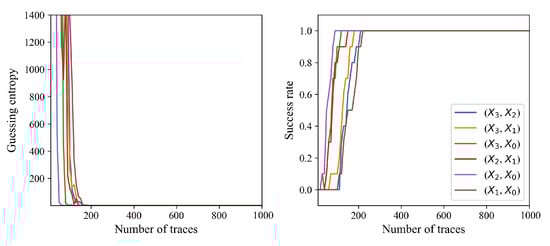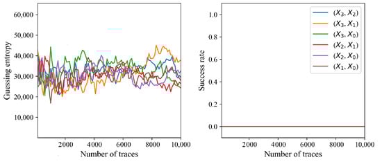 Figure 4 shows the absolute correlation coefficient of the correct and other keys according to the number of traces performed. If the number of traces exceeds 210, then the correlation of the correct key is greater than that of the 65,535 other incorrect keys. The correct key is evidently distinguishable if the number of traces exceeds 300. Figure 5 shows a guessing entropy and success rate that converge to one if the number of traces exceeds 210. Each CPA successfully reveals each round key with 210 traces. The CPA results exhibit the presence of a first-order vulnerability in the existing masking scheme.