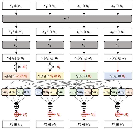 The existing masking method has a first-order vulnerability because its S-Box outputs are concealed with the same mask. We patch this method by concealing the S-Box outputs with different masks. Figure 6 illustrates the proposed masking method. The dissimilarity between the proposed masking method and the existing method is highlighted. The outputs of and are already concealed with different masks, and , respectively. Therefore, the proposed masking method only remasks the first two bytes by XORing and instead of and , respectively, where and . After XORing four S-Box outputs, they are remasked to by XORing , , , and , where