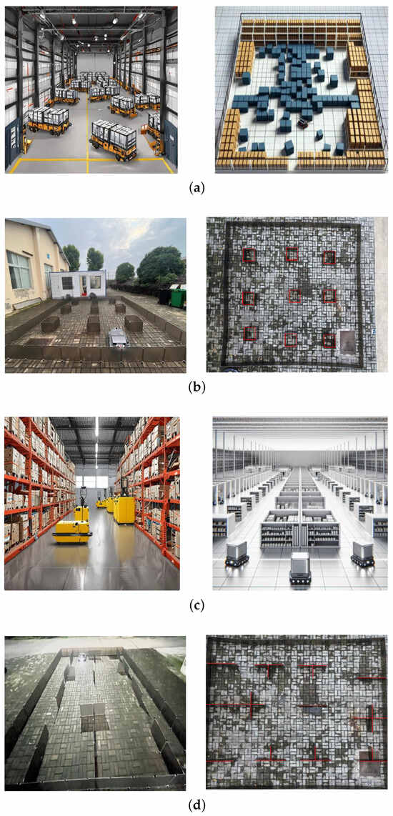 The unified Fully Automated Warehouse Environment [31] (see Figure 1a,c) was chosen to simulate real-world AGV operational scenarios, ensuring a comprehensive evaluation of the proposed algorithm’s performance under varied and challenging conditions. This environment replicates the complexity and diversity of actual warehouse and industrial settings, allowing for a thorough assessment of the algorithm’s robustness and adaptability. By incorporating distinct working conditions, the testing framework was designed to highlight the strengths and potential limitations of the AGV path planning method [31,32]. This approach ensured that the algorithm could effectively handle different types of obstacles and spatial constraints, providing valuable insights into its practical applicability. The detailed evaluation in this environment confirmed the algorithm’s capability to enhance operational efficiency and safety in automated warehouse systems.