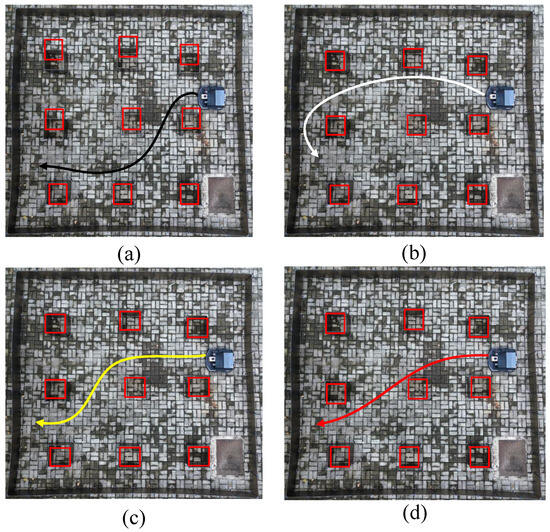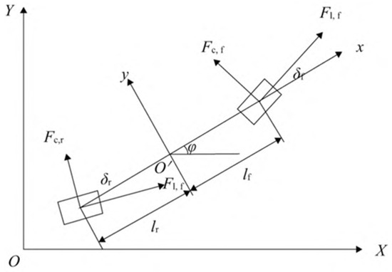 Here, is the global coordinate system referenced to the Earth coordinate system, and is the vehicle coordinate system referenced to the AGV’s own axis. The origin of the vehicle coordinate system is at the AGV’s center of mass, with the x-axis along the vehicle’s axis and the y-axis perpendicular to the x-axis [33]. and represent the longitudinal and lateral velocities at the center of mass in the vehicle coordinate system, is the yaw angle, m is the vehicle mass, and is the moment of inertia about the z-axis.