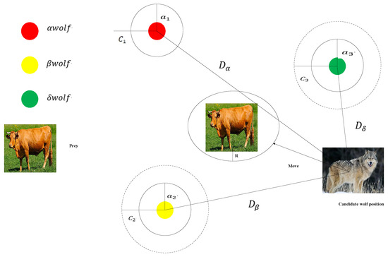 where , and are random vectors; X is the ith wolf in the current position vector; and are adaptive vectors; represents the current location of the wolf; represents the current location of the wolf; and is the current location of the wolf. Equations (6)–(8) describe the distances between an individual grey wolf and and wolves. Equation (12) defines the final position of the grey wolf individual.
