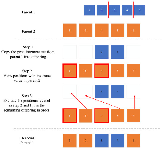 After the partially matched crossover (PMX) operation, there are still certain shortcomings in the selection of parent individuals, which may lead to the underutilization of superior individuals. To address this issue, this paper introduces a roulette wheel selection mechanism. Roulette wheel selection is a mechanism that selects individuals proportionally, with the probability being directly proportional to the individual’s fitness value. When selecting parents, this ensures that individuals with higher fitness values have a greater probability of being selected.