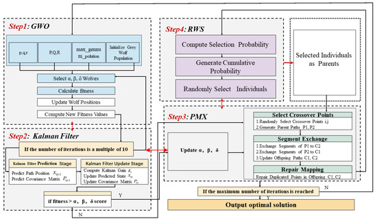 The Kalman filter is a recursive algorithm used in real-time control and signal processing to estimate system states and minimize noise. It provides adaptive adjustment, enabling dynamic refinement of the search strategy based on real-time feedback. Combining the global search capabilities of GWO with the adaptive adjustments of the Kalman filter improves the search precision and convergence speed. This hybrid method enhances the optimization efficiency, robustness, and adaptability across various environments.