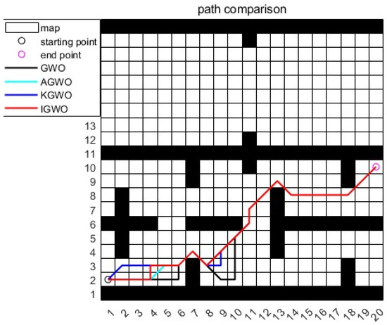 Similarly, Figure 16c depicts the path planned by the adaptive grey wolf optimizer (AGWO), which introduced adaptive weighting mechanisms to adjust search strategies based on environmental complexity. AGWO mitigates some challenges associated with traditional GWO but may require significant turning angles near obstacles, reflecting its general adaptability, without specialized obstacle-handling optimizations.