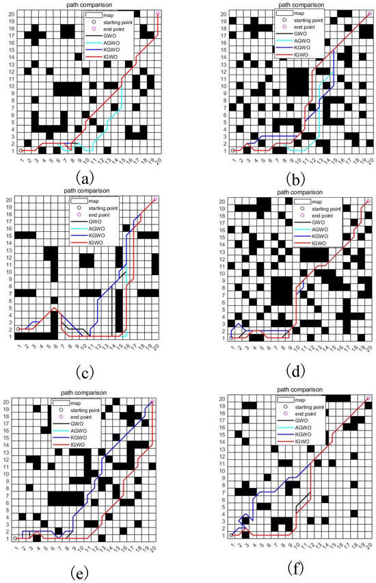 As shown in Figure 19a, the path planned by the traditional GWO algorithm exhibited more turning points, excessive angles, and longer routes. This was due to its limited local search capability in complex environments, leading to susceptibility to local optima.