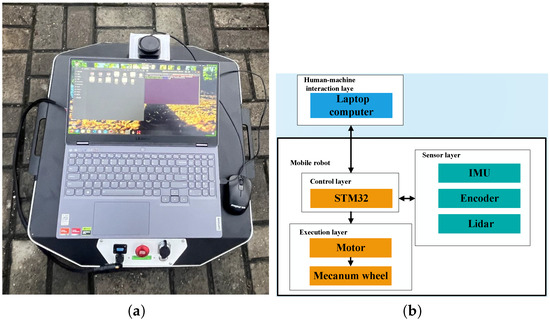 As shown in Figure 12b, the hardware system architecture comprised control, sensing, execution, and human–machine interaction layers. These layers work together seamlessly during navigation tasks. Commands from the human–machine interaction layer are sent to the control layer of the mobile robot. The control layer processes these commands, along with environmental perception data from the sensing layer and self-state information, controlling the execution layer’s motion in real-time via serial communication to complete tasks such as map creation and path planning.