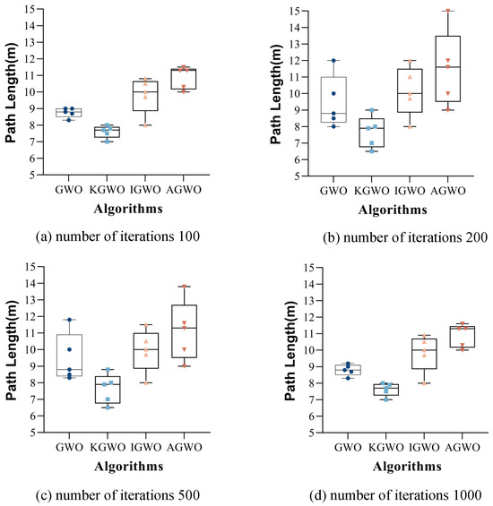 Finally, Figure 16d illustrates the paths generated by the KGWO algorithm studied in this research. KGWO integrates Kalman filter and probability model crossover (PMX) operations, significantly enhancing prediction accuracy and path planning robustness in complex dynamic environments. As shown in Table 8, this approach reduced the average path length by 1.56 m, decreased the time spent by 5.6 s, and minimized the number of turns, resulting in smoother paths. These improvements are attributed to KGWO’s superior adaptability and prediction capabilities in dynamic environments, thereby overcoming limitations observed in the previous GWO, IGWO, and AGWO algorithms.