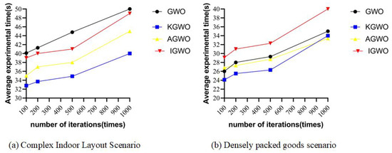 To verify whether changes in the number of iterations affected the longest path and experiment time of the algorithms, experiments were conducted using the four algorithms with the same population size in the environments depicted in Figure 1b,d.