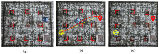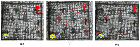 The process of the robot (from (a–c): the start, through the planned path, and final destination).