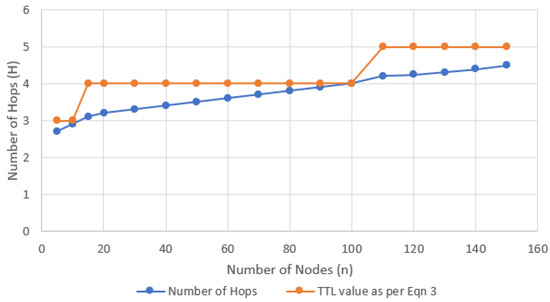 To support effective multipath forwarding in the BLE network, we assume that the node density = n/A [2] is high enough that each node would have at least two neighbors, which ensures that different paths from source to destination can be established. For the proposed M-O-AODV, we calculated the area of coverage A for a given number of nodes placed randomly with uniform distribution using Equation (1) [2], given that the probability that the network is k-connected is 100%, k = 2, and transmission range = 10 m. We then used Equation (2) in [3] to calculate the worst-case number of hops (H) for the given area of coverage A. Additionally, the formula for the TTL is provided in Equation (3), given as a function of the number of nodes n, which is expected to increase in proportion to the worst-case number of hops.