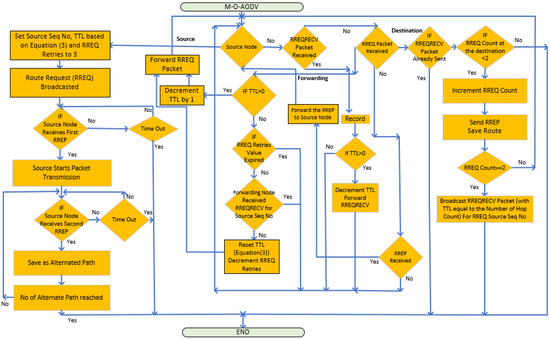 Moreover, the flowchart in Figure 2 shows the data flow for the M-O-AODV protocol.