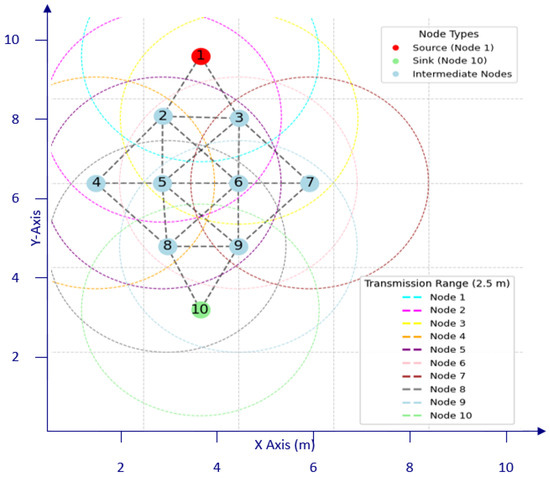 In addition, the area of coverage A calculated using Equation (1) is shown in Table 2, illustrating the scalability of the proposed approach for typical indoor sensor-enabled IoT applications, aligned with the authors’ findings in [31].