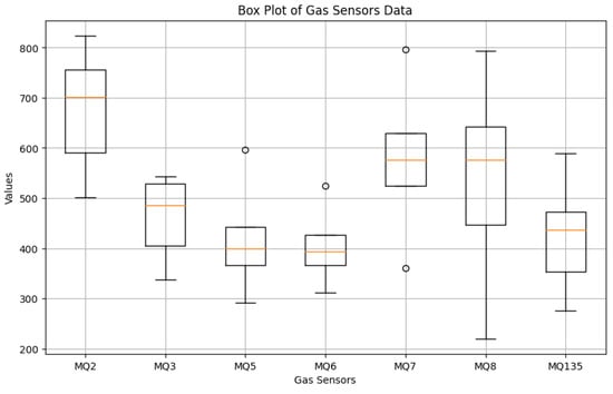 The total number of samples in the multimodal gas data dataset is 6400. Four classes comprising 6400 samples are equally distributed. The dataset includes 1600 samples for the perfume class, 1600 samples for the smoke class, and 1600 samples for a combination of the two classes, as shown in Table 2 and Table 3. For the neutral environment (No gas) class, the remaining 1600 samples were gathered. The statistical analysis is also conducted to highlight the variation in the created dataset, and the results are given as a box plot in Figure 3, along with the statistical properties for the data acquired from gas sensors.