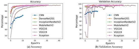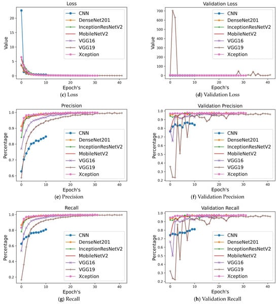 Figure 6 compares the models’ performance in terms of training accuracy, validation accuracy, training precision, validation precision, training recall, validation recall, training loss, and validation loss, and it reveals that seven models perform better than the other six. A comparison of the seven designs’ training accuracy is displayed in the training accuracy graph. As can be seen, the DensNet201 and Xception models were picking up new knowledge from the training data at a respectable pace, as their upward trending lines demonstrated. At 83.000%, CNN has the lowest training accuracy (blue line). Still, each model increased its initial value from a little one. The loss functions were reduced when the models were trained for longer durations. Using test accuracy as a metric, the second figure compares and contrasts seven distinct designs. The fact that all model graphs are rising upwards in each epoch indicates that our suggested model did extraordinarily well in detecting gas leaks. The gas dataset was suitable for training our models, as shown by these results. Using the test dataset, the models accurately identified gas without being over-fit or under-fit. It is for these reasons that the models’ outstanding performance in the confusion matrix and classification report is explicable.