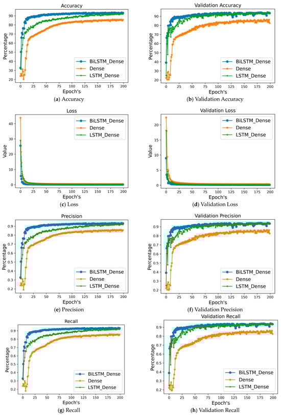 Three deep neural networks—LSTM_DenseDenseNet201, BiLSTM_Dense, and Dense—were selected to recognize gas from CSV data. Figure 7 shows a comparison of training accuracy, test accuracy, validation loss, precision, recall, validation recall, and validation precision for these models.