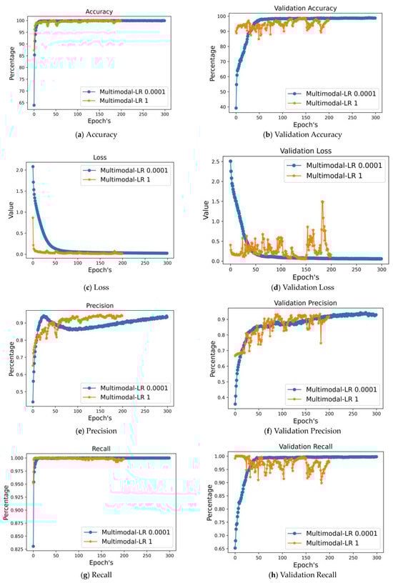 A precise decision was reached after combining the gas sensor results with the features extracted from thermal images. Using data from many modalities enhances the classifier’s accuracy compared to using data from a single modality alone. By utilizing multimodal representations, it is possible to train a classifier on labelled data from one modality and then apply it to data from another modality while maintaining an acceptable accuracy score. Figure 8 contrasts several metrics (training accuracy, test accuracy, recall, validation precision, validation loss, model loss function, and validation recall) to help us grasp the benefits of multimodal data. We used both slow and quick processing on multimodal data to validate our findings. According to the table, multimodal with learning rate 0.0001 (slow) performs better than multimodal with learning rate 1 (rapid) across all evaluation criteria, as shown in Table 7. Additionally, compared to single data, the accuracy and loss values for multimodal data are superior.
