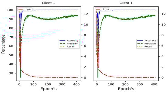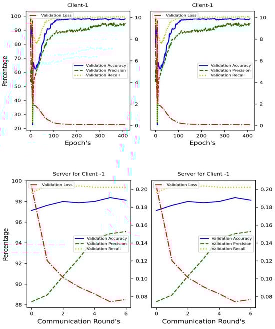 Before selecting 10% of the clients for local training, the server engages in a maximum of six communication cycles with the clients in this scenario. Client side local training has been conducted with 100 epochs on each client with five total communication rounds between federated clients and federated server. The learning rate for the training set is 0.001.