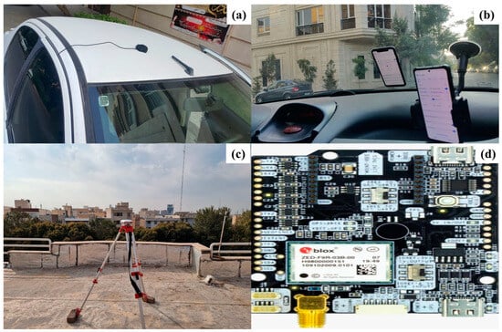 The U-Blox antenna installed on the car roof (a), the Xiaomi Mi8 (left) and Samsung Galaxy S21 Ultra (right) mounted in the car (b), the Stonex S3II SE geodetic receiver (c), and the ZED-F9R receiver chipset used for the U-Blox antenna (d).