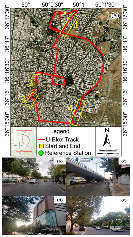 The vehicle’s path while logging measurements using smartphones and the U-Blox receiver (a). (b–e) Field photos of the 4 selected parts of paths 1, 2, 3, and 4 in (a), respectively.