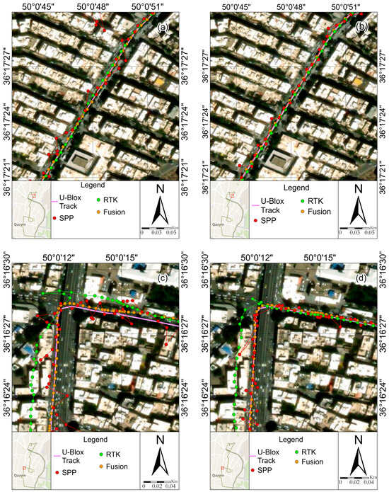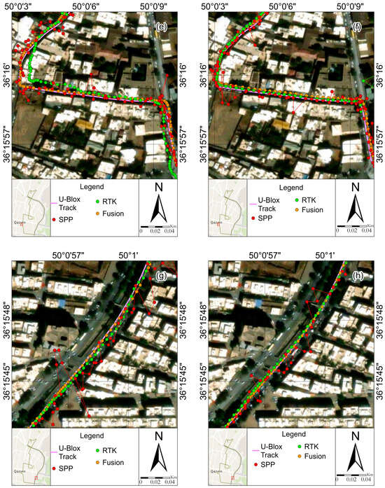 Field observations were processed using the RTKLIB for the SPP and RTK methods. For the RTK/INS fusion results, a separate custom software framework was used. This framework integrates GNSS data with INS measurements to enhance the positioning accuracy. We ensured that the quality control methods in our custom software aligned with those used in RTKLIB to make the results comparable. Specifically, both systems employ similar outlier detection and correction mechanisms. While the RTKLIB was used for the SPP and RTK processing, the RTK/INS fusion results were obtained using a custom software framework designed to integrate the GNSS and INS data effectively. We acknowledge that using different software for these processes could introduce variations due to differing quality control methods. However, we have aligned the quality control procedures between the RTKLIB and our custom software to ensure that the results are directly comparable. This approach allows us to leverage the strengths of each processing method while maintaining consistency in the data quality assessment. Next, the results are compared with the RTK/INS fusion method for two smartphones, the Xiaomi Mi 8 and Samsung S21 Ultra, using the U-Blox ZED-F9R receiver model. A sample case analysis was conducted on four segments of the overall vehicle trajectory. Figure 4 illustrates the trajectories of the results of three different methods, SPP, RTK, and RTK/INS fusion, respectively, on four streets, Daneshgah, Peighambarieh, Naderi, and Khorramshahr. The figures on the right (i.e., b, d, f, and h) show the results of the Mi 8, and the figures on the left (i.e., a, c, e, and g) show the results of the S21 Ultra. Also, Table 2 and Table 3 compare the horizontal error of the positioning results with the S21 Ultra and Xiaomi Mi 8 smartphones from the three SPP, RTK, and fusion methods with the U-Blox receiver.