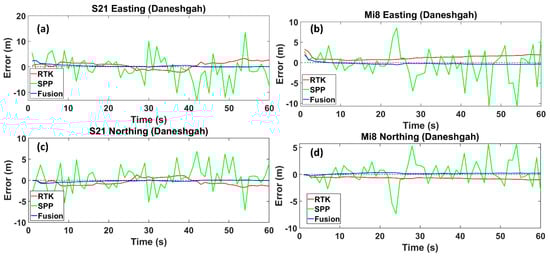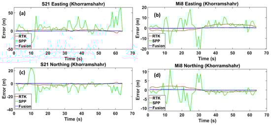 Easting and Northing errors regarding the reference trajectory for the Samsung Ultra S21 (a,c), and Xiaomi Mi8 (b,d), on Daneshgah Street, respectively. The dotted line is the zero-error axis.