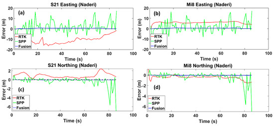 Easting and Northing errors regarding the reference trajectory for the Samsung Ultra S21 (a,c), and Xiaomi Mi8 (b,d), on Naderi Street, respectively. The dotted line is the zero-error axis.