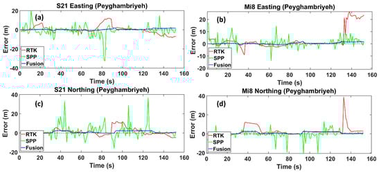 Peighambarieh Street is a narrow street with some high-rise buildings. The RMS values in RTK mode for the Xiaomi Mi8 and Samsung S21 Ultra are around 9.805 m and 5.425 m, which, with the fusion method, decreased to 1.188 m and 1.515 m, respectively. These reductions of 88% and 72% are achieved by utilizing the fusion method instead of the RTK mode. Likewise, in the SPP mode, the results of the fusion method show upward trends of about 73% and 83% for the Xiaomi Mi8 and Samsung S21 Ultra, respectively. It is worth mentioning that the RMS values in the SPP mode are 4.484 m and 8.83 m, respectively (Figure 7). The results emphasize that the employed method is capable of overcoming various urban conditions. Both smartphones demonstrate precise positioning with the RTK mode, indicating that they can achieve high accuracy when RTK positioning is available. The SPP mode has the highest errors in both devices. This is expected, as the SPP mode typically does not use differential corrections and is thus more susceptible to errors due to atmospheric conditions, satellite geometry, and other factors. The fusion method consistently reduces the error compared to the SPP mode for both devices by effectively utilizing additional data sources or algorithms to enhance the accuracy.